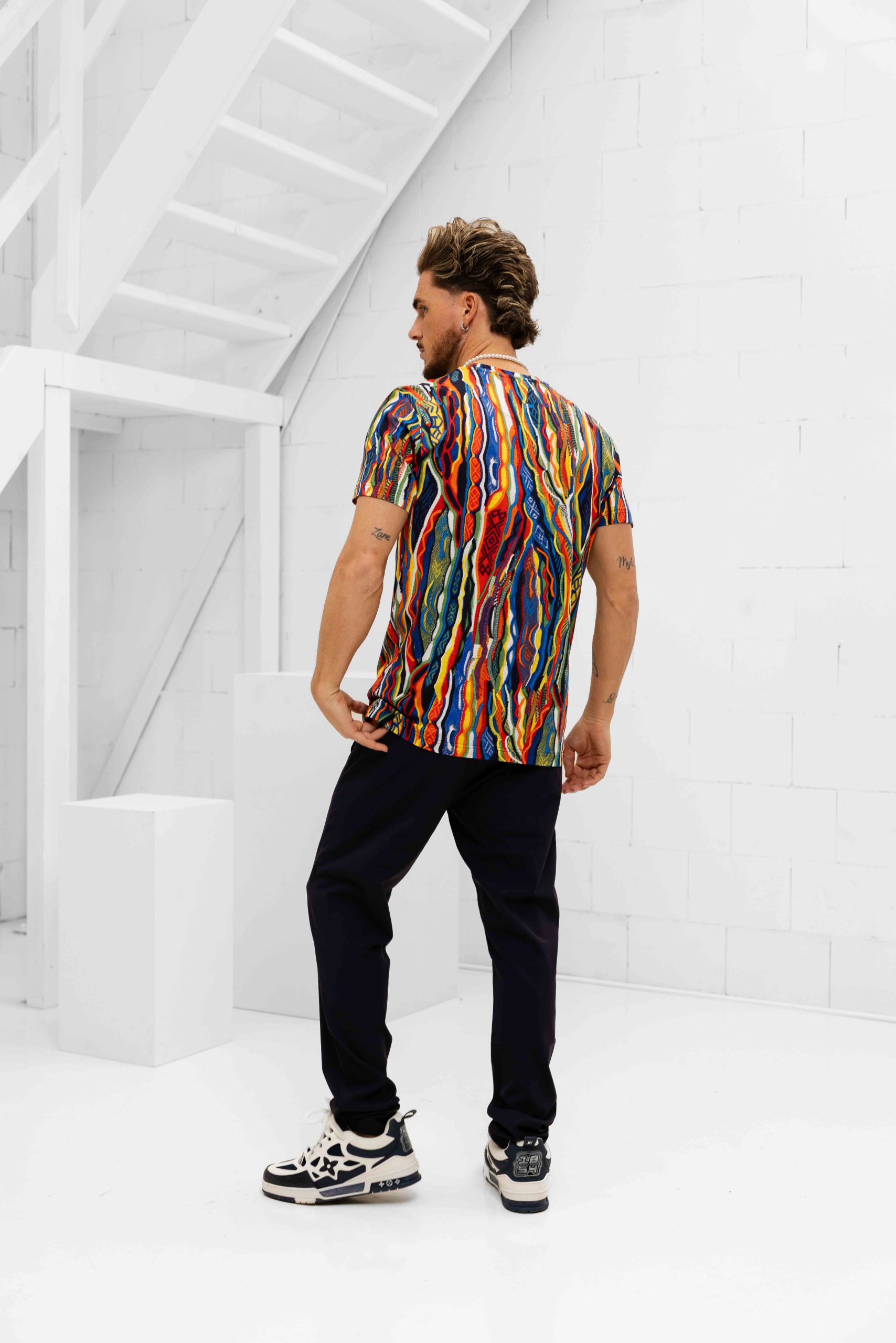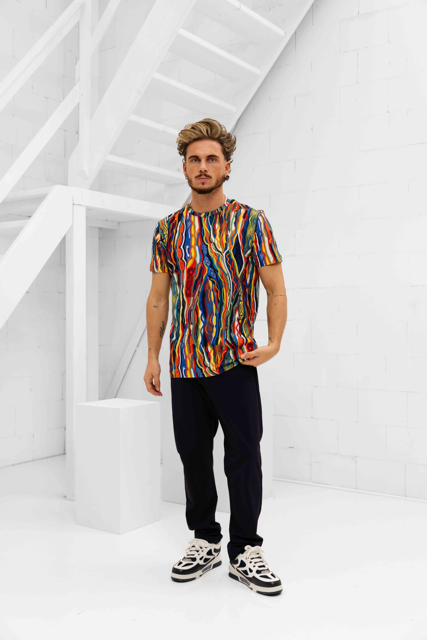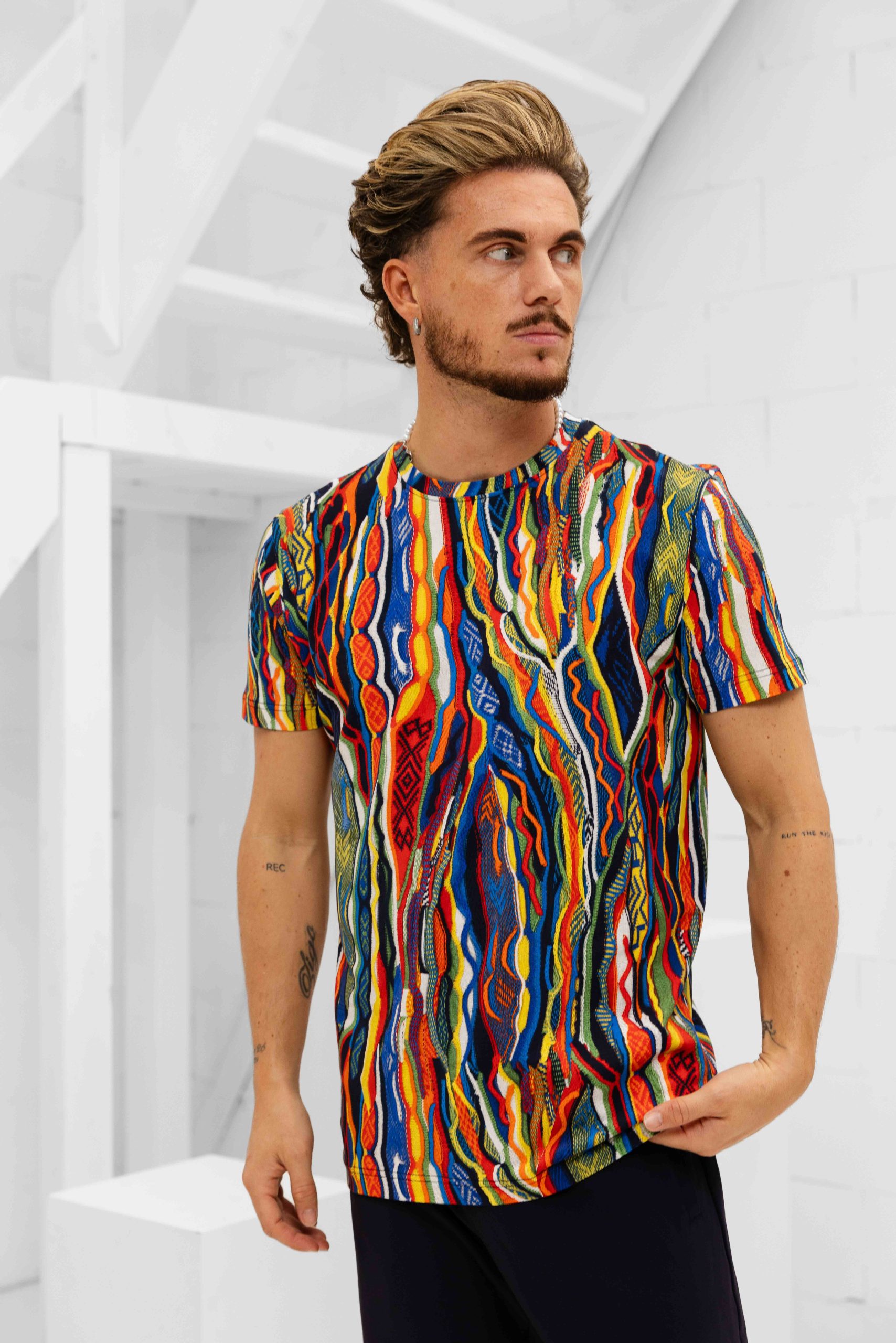 Het Carlo Colucci C3409 101 T-Shirt voor heren is een must-have item voor het komende herfst/winterseizoen. Dit T-shirt heeft een ronde hals en korte mouwen, waardoor het perfect is voor dagelijks gebruik. De pasvorm is normaal en het materiaal bestaat uit 92% katoen en 8% elastaan, wat zorgt voor een comfortabele en flexibele pasvorm. Het T-shirt is voorzien van een opvallende multicolour print, waardoor het een trendy en stijlvolle toevoeging is aan elke outfit. Met dit Carlo Colucci T-shirt ben je helemaal klaar voor de koude maanden!