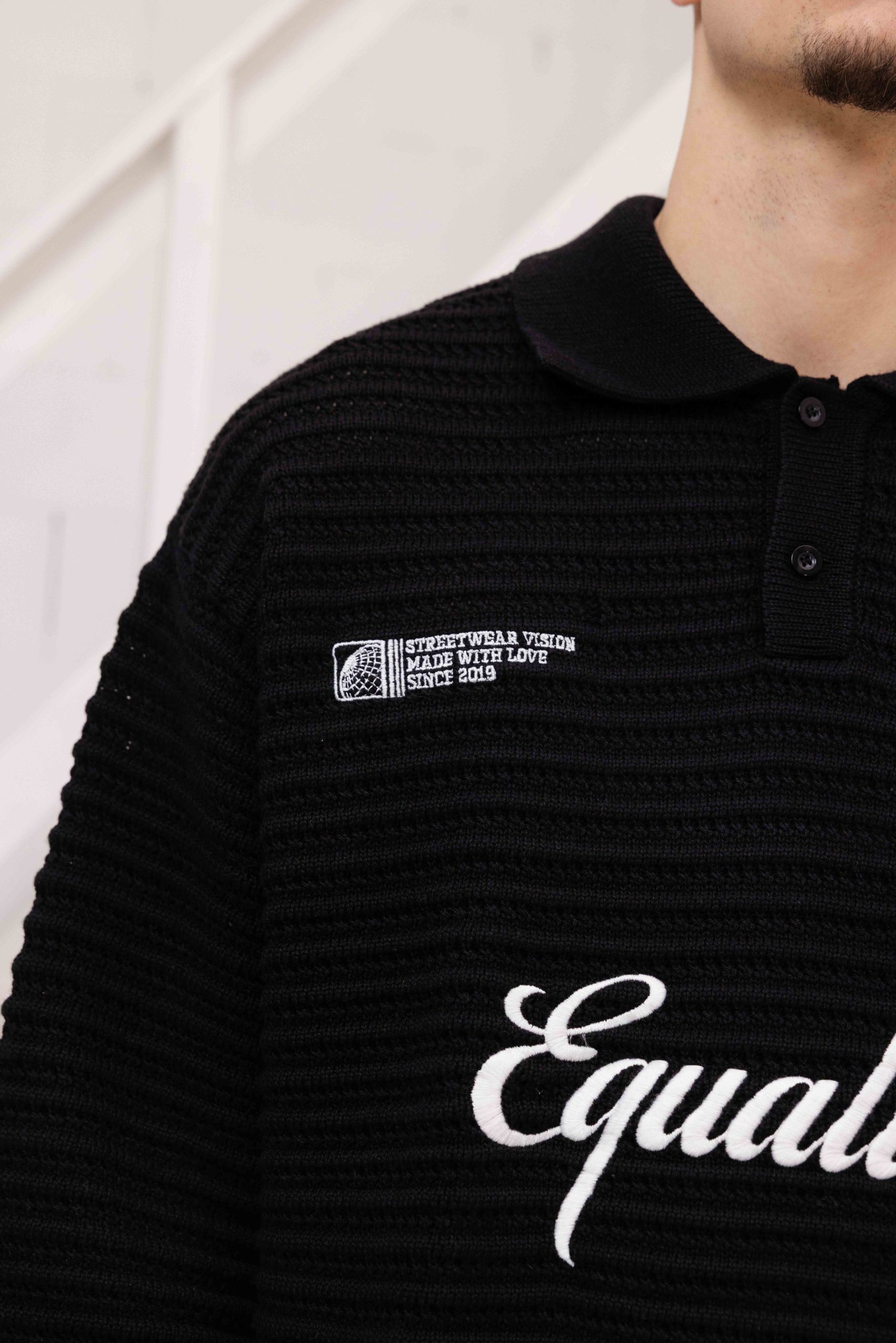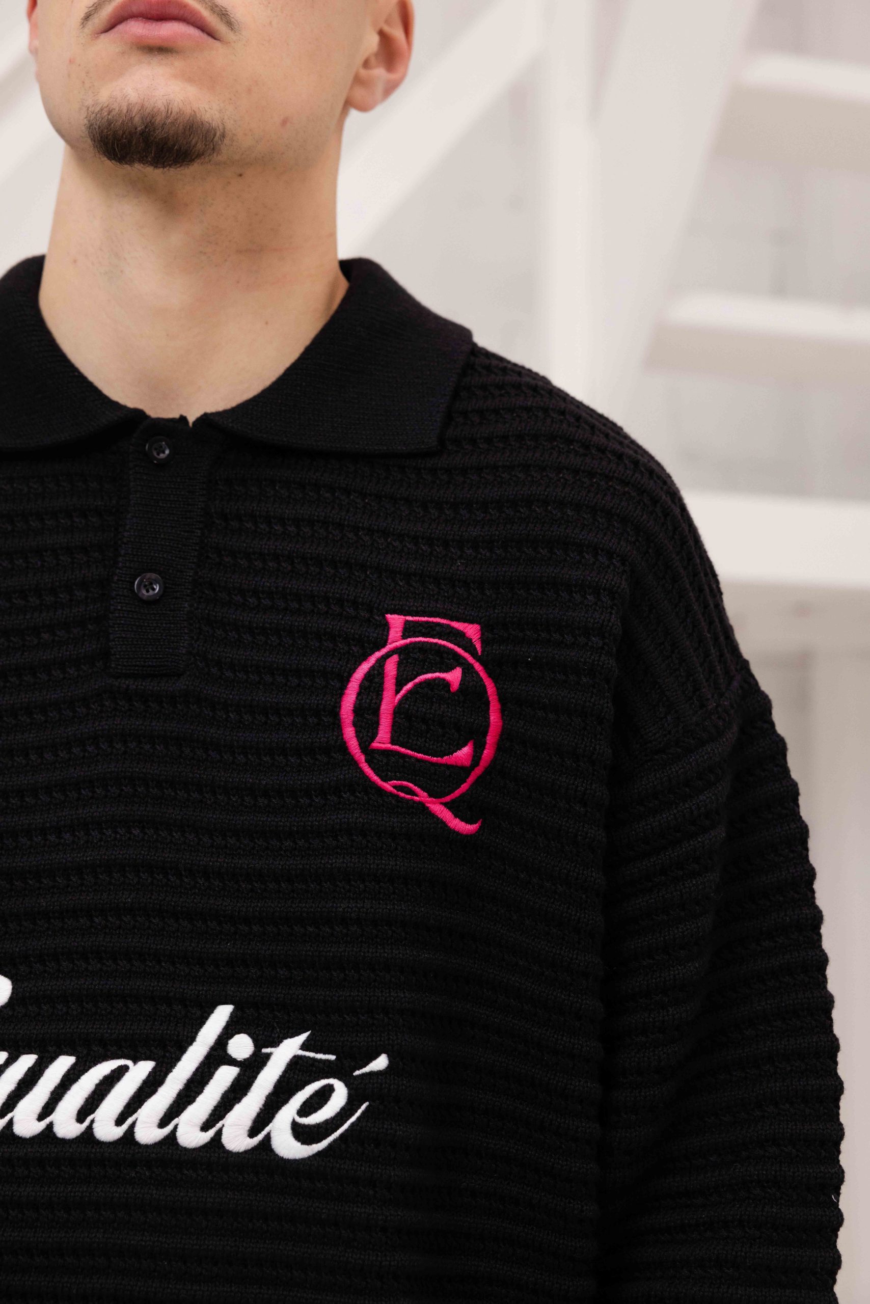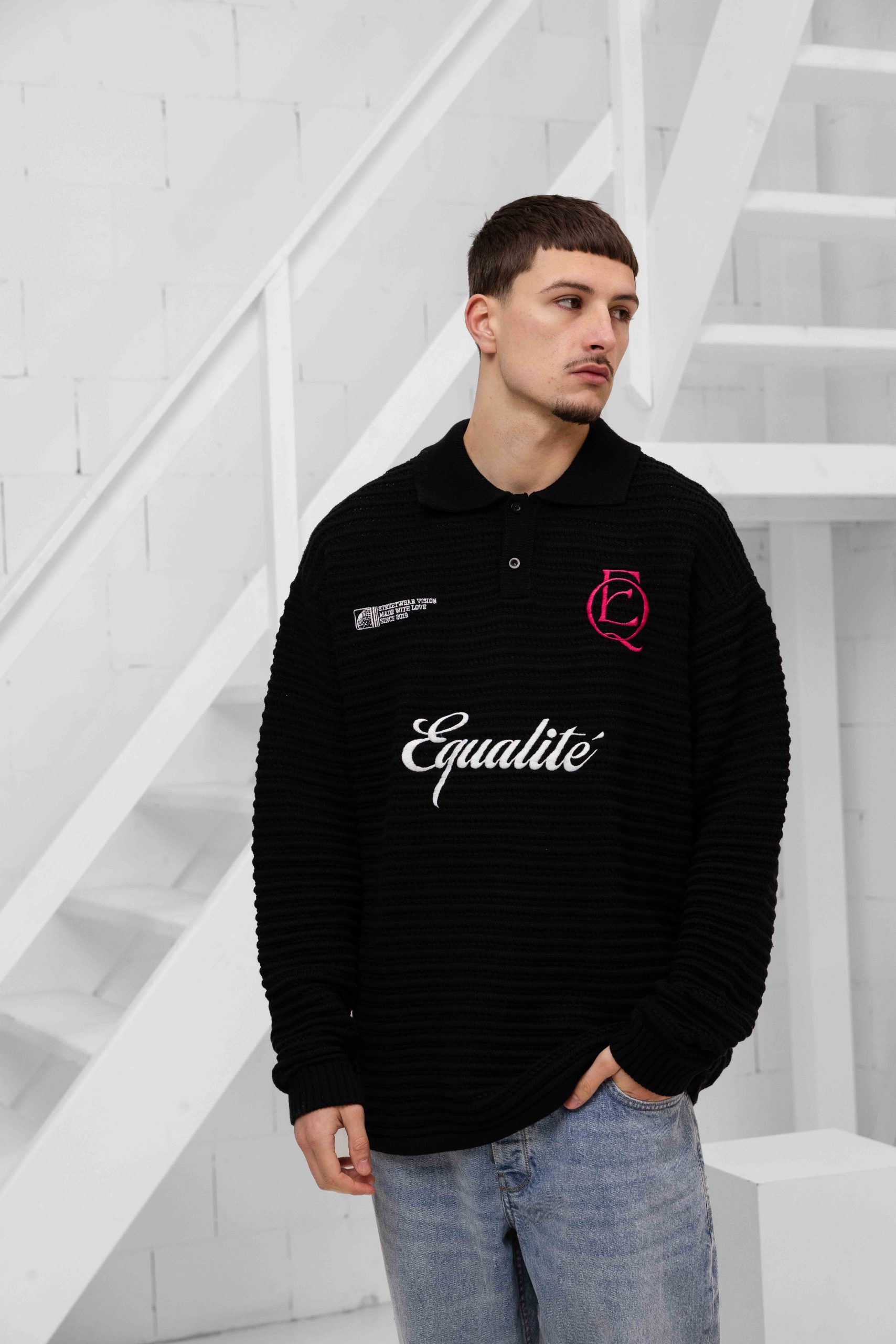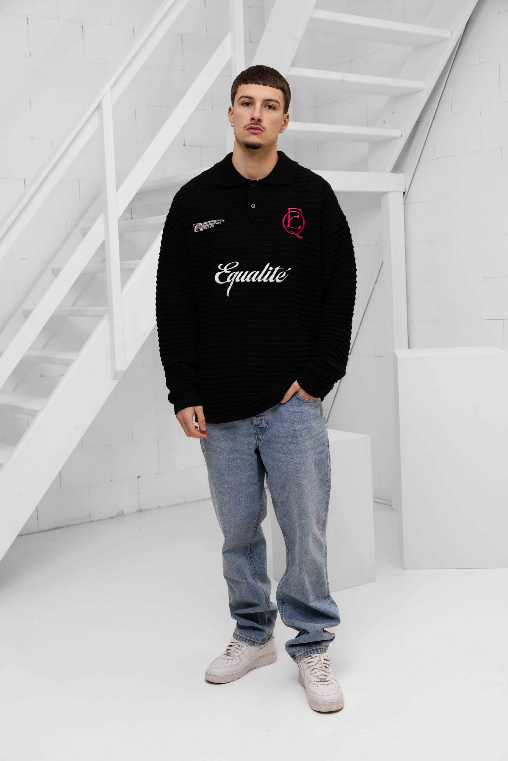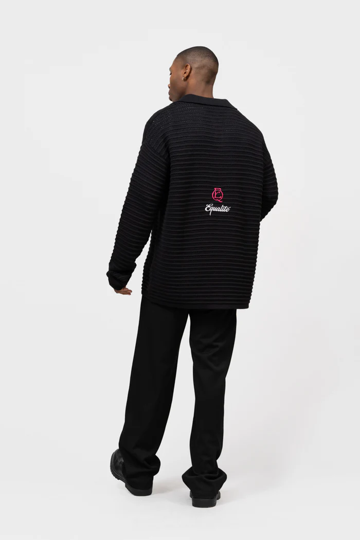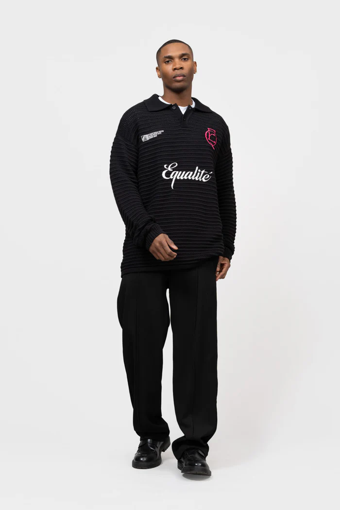 De Equalité Heritage Rib Knit Polo voor heren is een must-have item voor de herfst/winter collectie. Deze zwarte longsleeve polo heeft een kraag en lange mouwen, waardoor het zowel stijlvol als comfortabel is. De polo heeft een oversized pasvorm en is gemaakt van een mix van viscose, polyester en polyamide voor een zachte en warme feel. Het effen patroon en de afwezigheid van sluitingen zorgen voor een minimalistische uitstraling. Met dit item van het merk Equalité ben je helemaal on-trend deze seizoenen.