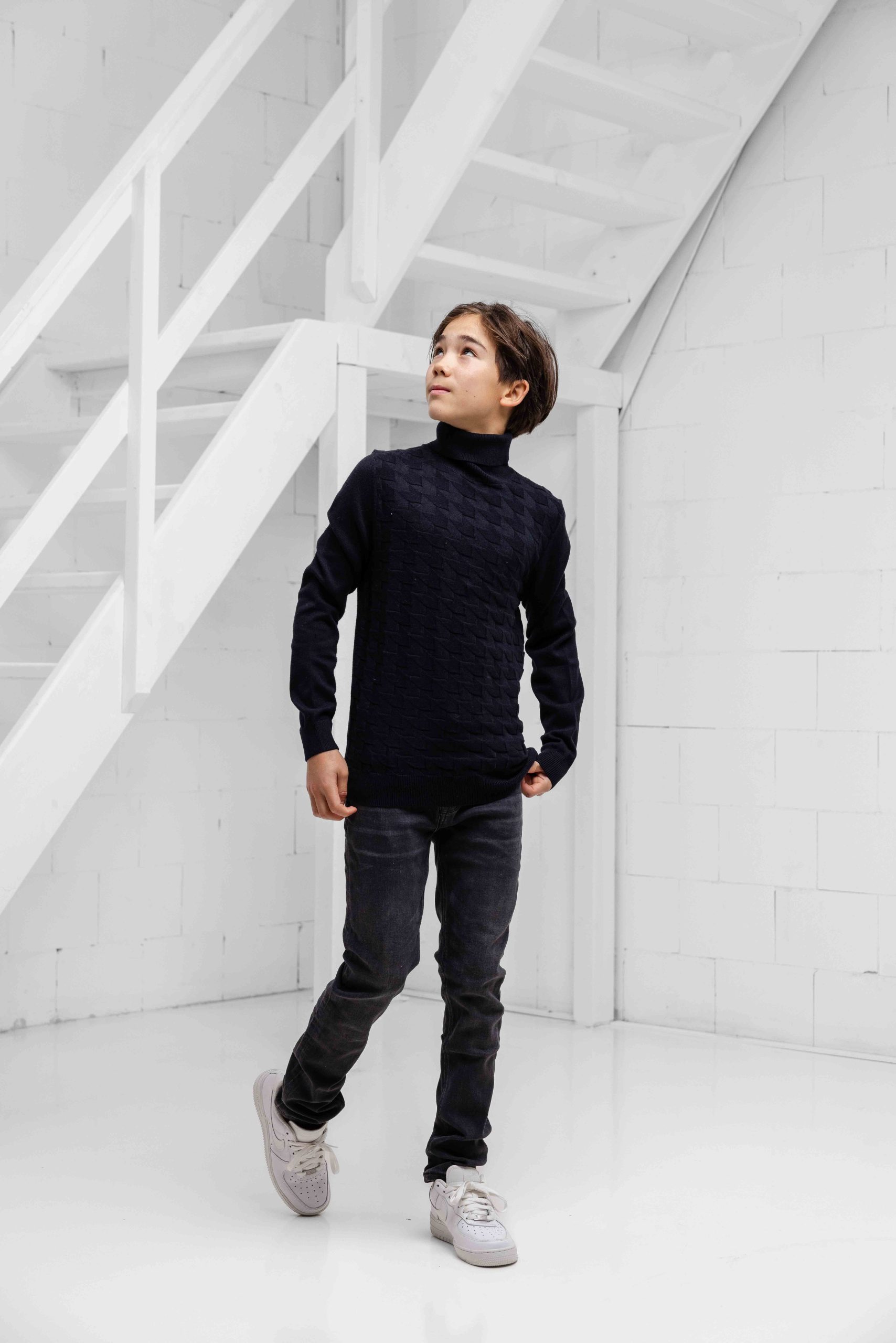 Desmond is 1 meter 53 lang, zijn gewicht is 38 kilo en hij draagt een maat 152 top en een maat 152 broek.